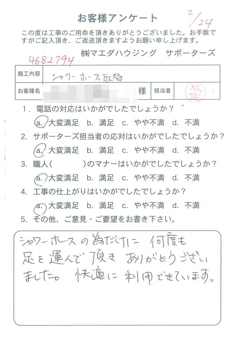 シャワーホースの為だけに何度も足を運んで頂きありがとうございました。快適に利用できています。