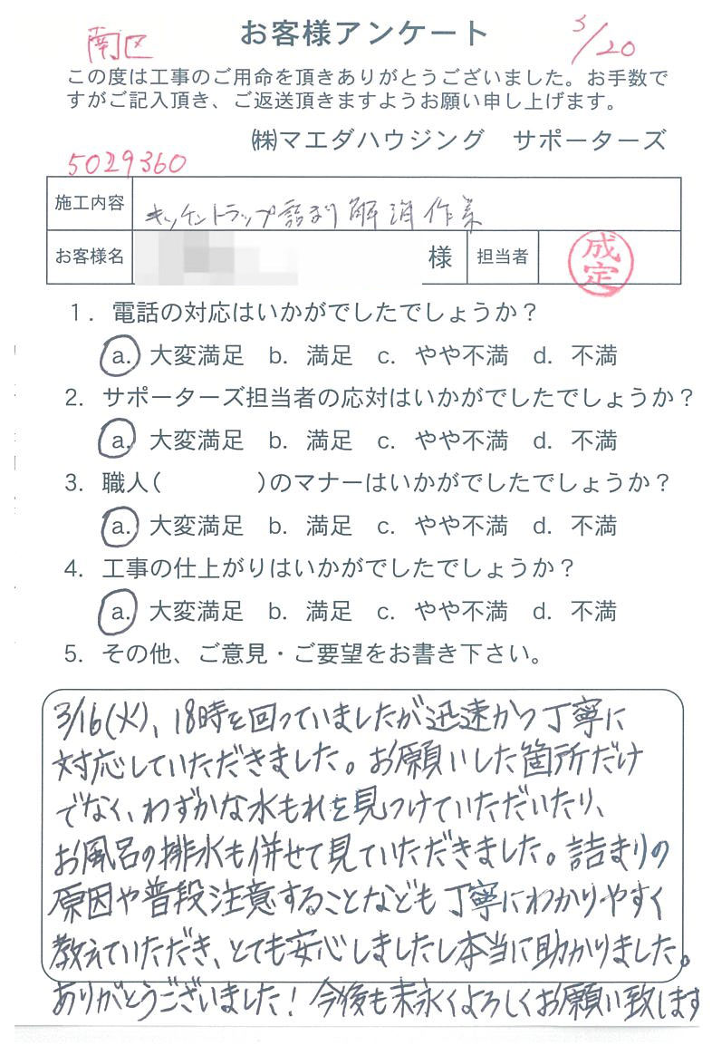 施工内容 キッチントラップ詰まり解消作業 3/16(火)、18時を回っていましたが、迅速かつ丁寧に対応していただきました。お願いした箇所だけでなく、わずかな水もれを見つけていただいたり、お風呂の排水も併せて見ていただきました。詰まりの原因や普段注意することなども丁寧にわかりやすく教えていただき、とても安心しましたし本当に助かりました。 |