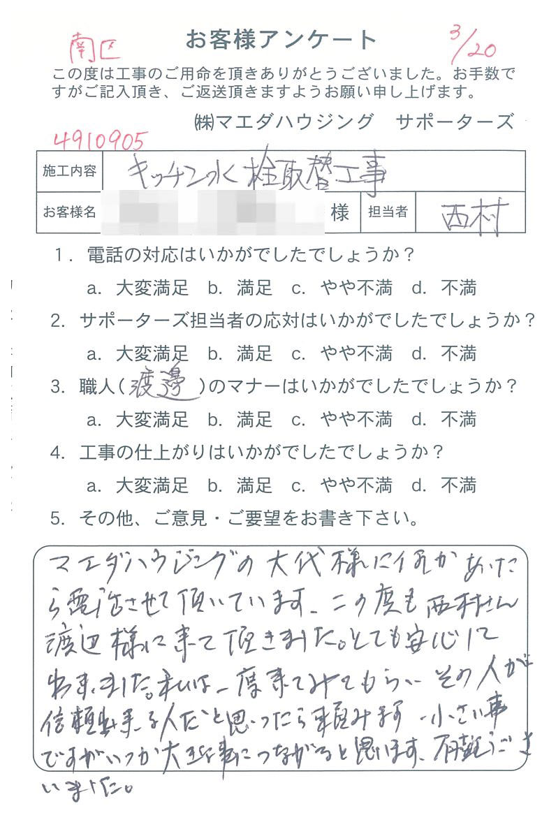 施工内容 キッチン水栓取替工事 マエダハウジングの大代様に何かあったら電話させて頂いています。この度も西村さん渡辺様に来て頂きました。とても安心して出来ました。私は一度来てみてもらいその人が信頼出来る人だと思ったら頼みます。小さい事ですがいつか大きな事につながると思います。有難うございました。 |