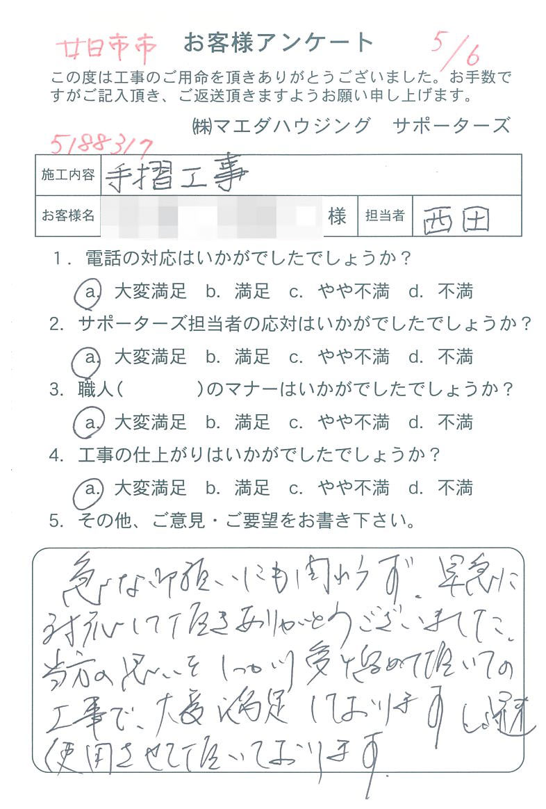 急な御願いにも関わらず、早急に対応して頂きありがとうございました。当方の思いをしっかり受け留めて頂いての工事で、大変満足しております。早速使用させて頂いております。