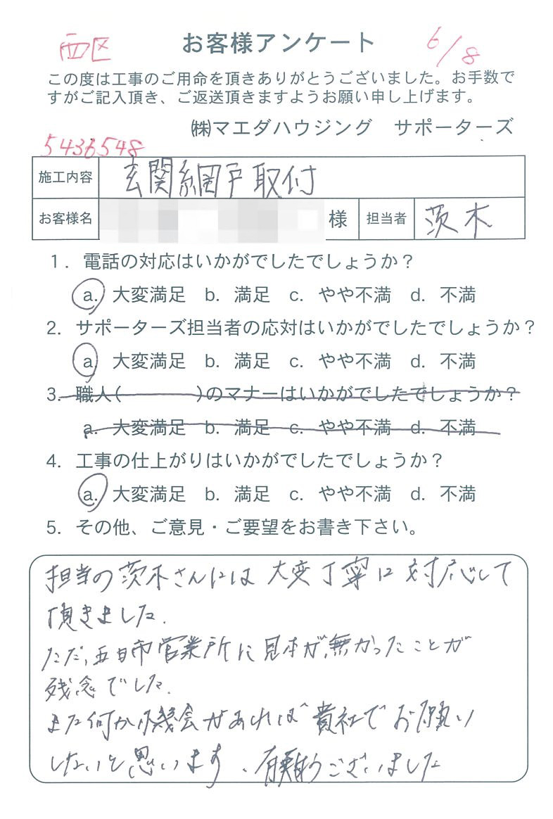 担当の茨木さんには大変丁寧に対応して頂きました。ただ、五日市営業所に見本が無かったことが残念でした。また何か機会があれば、貴社でお願いしたいと思います。有難うございました。