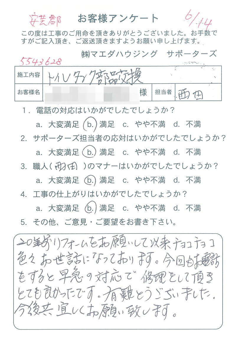 建物 マンション 20年前リフォームをお願いして以来、チョコチョコ色々お世話になっております。今回もお電話をすると早急の対応で修理をして頂きとても良かったです。有難とうございました。 |