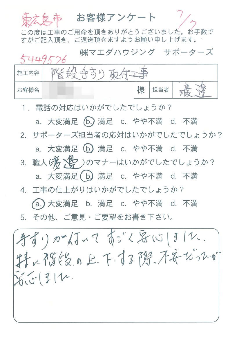 手すりが付いてすごく安心しました。特に階段の上下する際、不安だったが、安心しました。