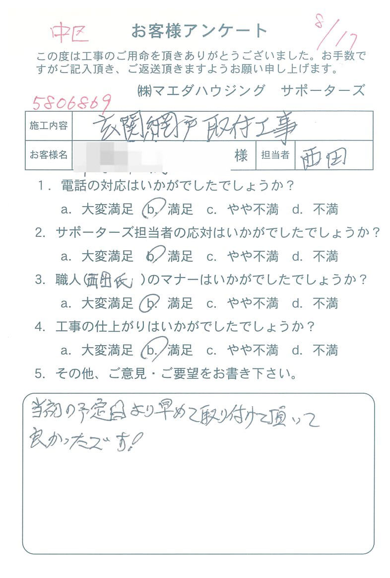 中区 玄関網戸取付工事