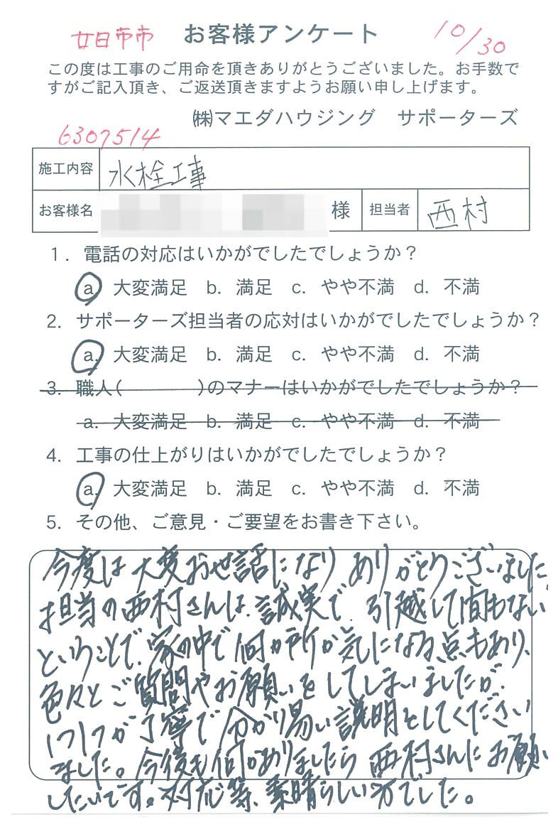 建物 マンション 今度は大変お世話になり ありがとうございました。担当の西村さんは、誠実で、引越して間もないということで、家の中で何か所か気になる点もあり、色々とご質問やお願いをしてしまいましたが、1つ1つが丁寧で分かり易い説明をしてくださいました。今後も何かありましたら 西村さんにお願いしたいです。対応等、素晴らしい方でした。 |