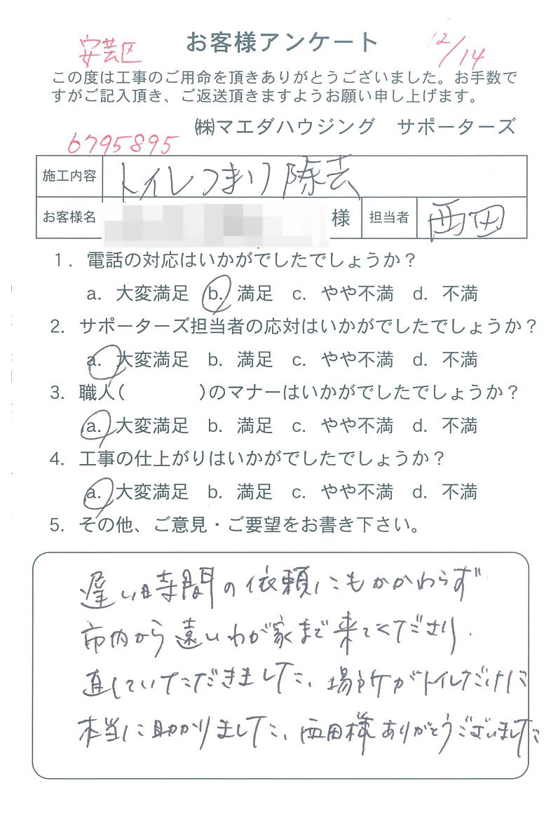 遅い時間の依頼にもかかわらず市内から遠いわが家まで来てくださり、直していただきました。場所がトイレだけに本当に助かりました。西田様ありがとうございました。