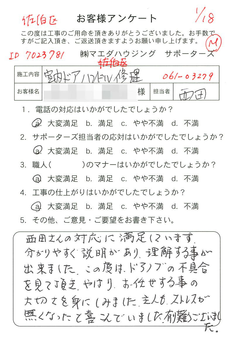 建物 マンション 西田さんの対応に満足しています。分かりやすく説明があり、理解する事が出来ました。この度はドアノブの不具合を見て頂き、やはりお任せする事の大切さを身にしみました。主人もストレスが無くなったと喜んでいました。有り難うございました。 |
