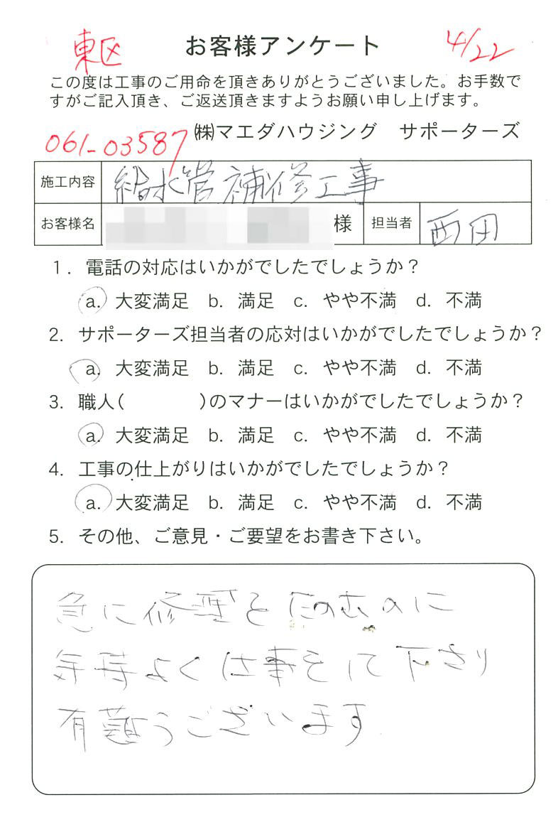 急に修理をたのむのに気持よく仕事をして下さり有難うございます。
