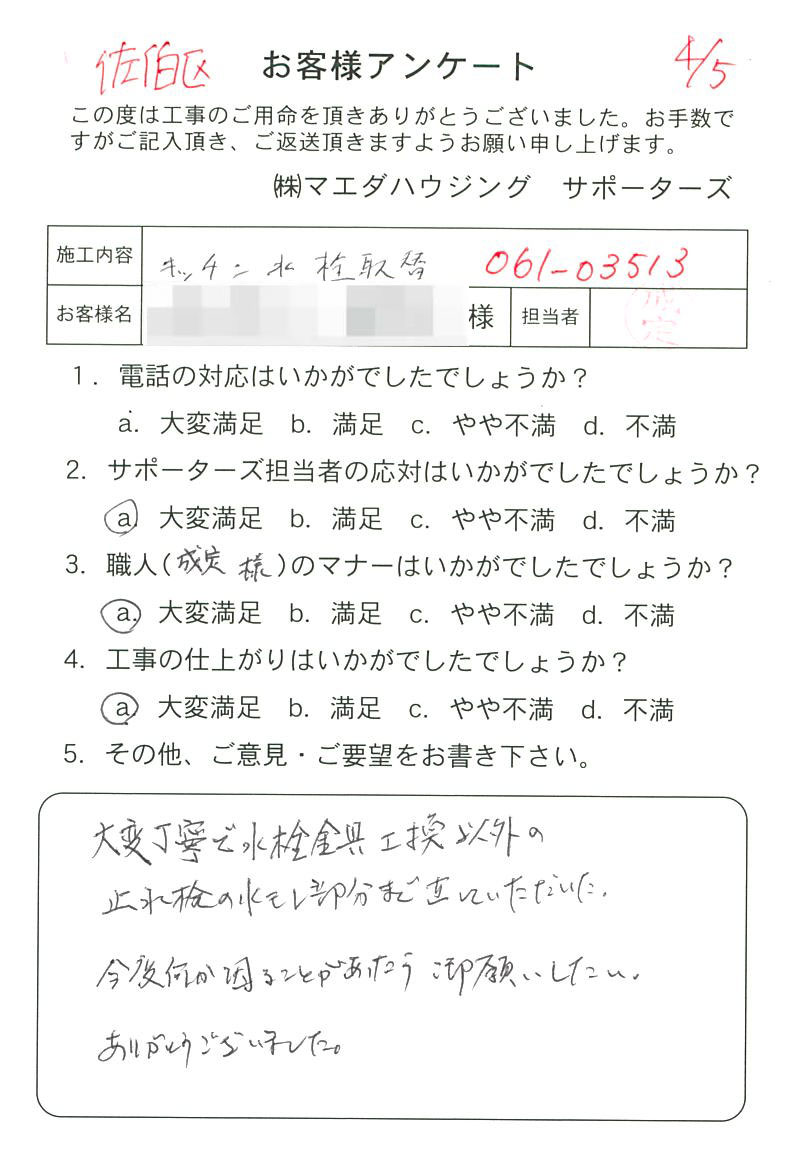 大変丁寧で水栓金具交換以外の止水栓の水モレ部分まで直していただいた。今後何か困ることがあったら御願いしたい。