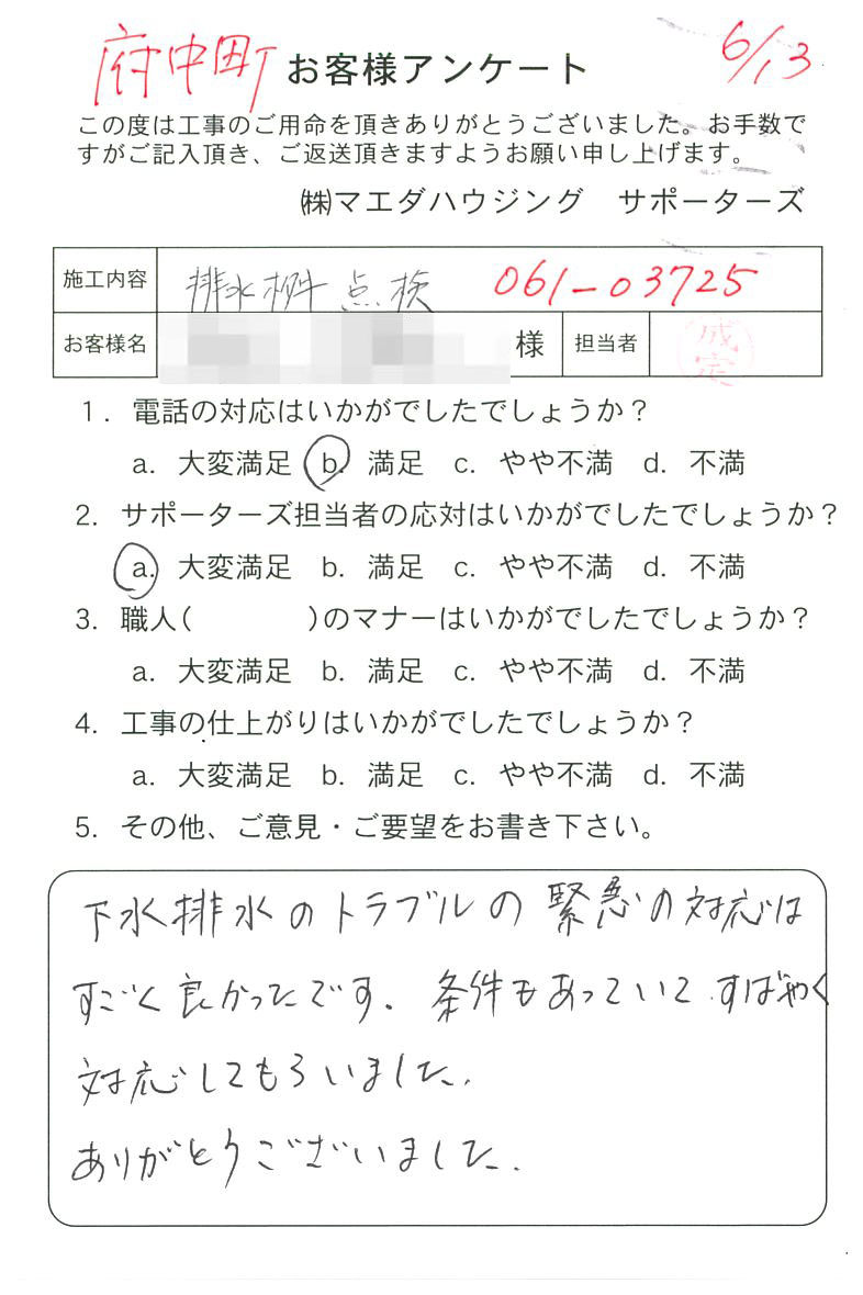 下水排水のトラブルの緊急の対応はすごく良かったです。条件もあっていて、すばやく対応してもらいました。ありがとうございました。