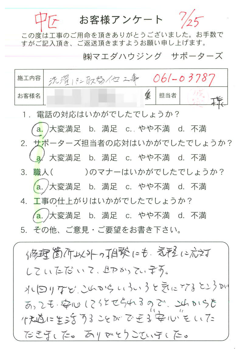 修理箇所以外の相談にも、気軽に対応していただいて、助かっています。水回りなど、これからいろいろと気になるところがあっても、安心して任せられるので、これからも快適に生活することができる"安心"をいただきました。ありがとうございました。