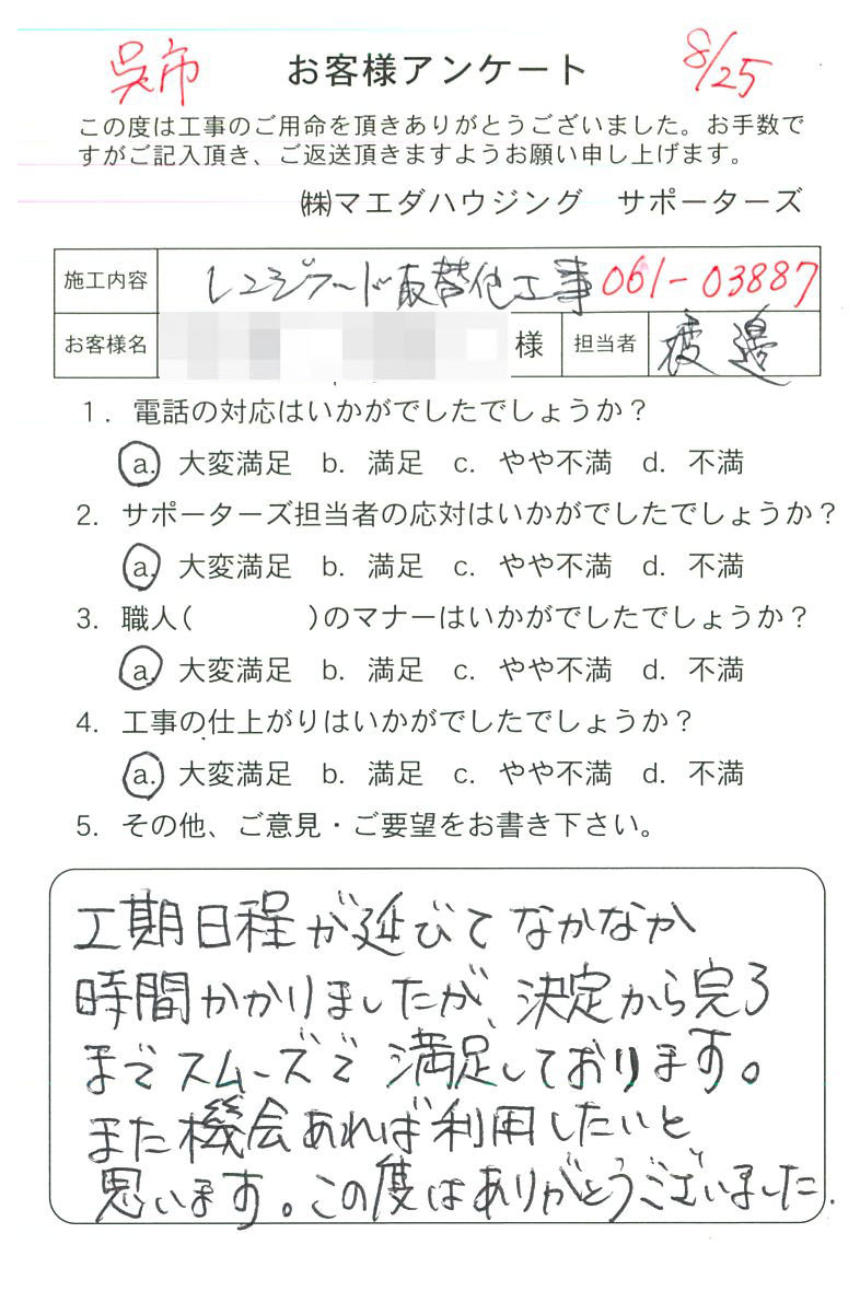 工期日程が延びてなかなか時間がかかりましたが、決定から完了までスムーズで満足しております。また機会あれば利用したいと思います。この度はありがとうございました。