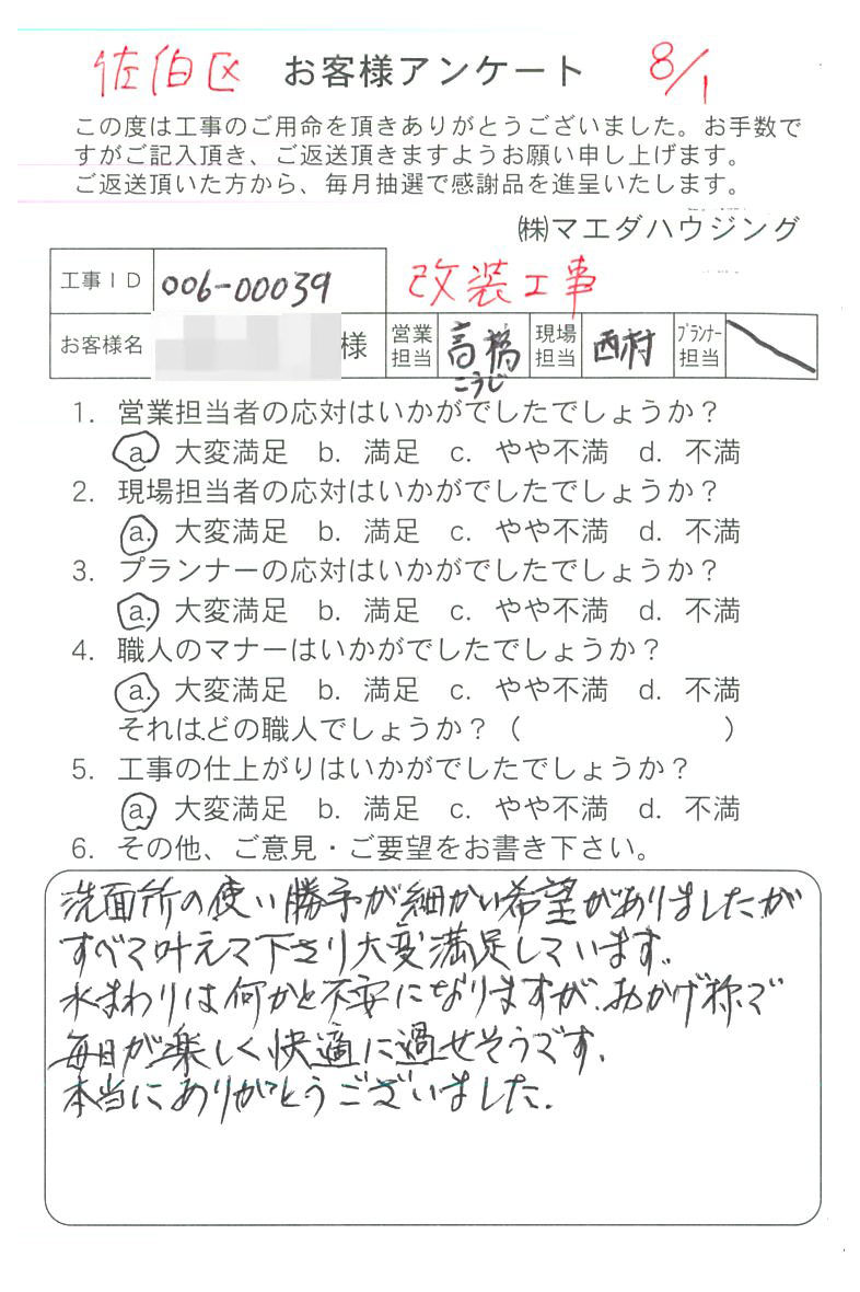 洗面所の使い勝手が細かい希望がありましたが、すべて叶えて下さり大変満足しています。水まわりは何かと不安になりますが、おかげ様で毎日が楽しく快適に過せそうです。本当にありがとうございました。