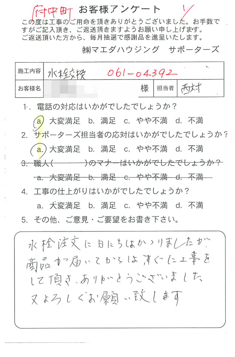 水栓注文に日にちはかかりましたが、商品が届いてからはすぐに工事をして頂き、ありがとうございました。又よろしくお願い致します。