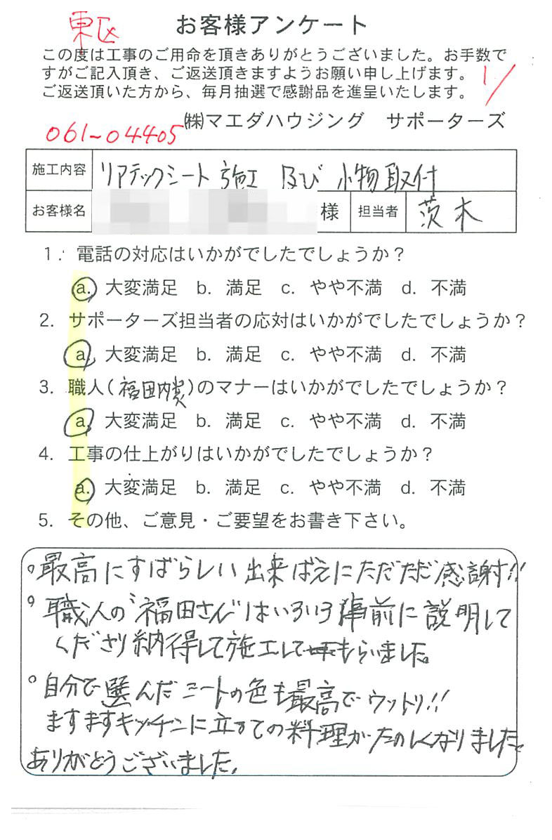 ・最高にすばらしい出来ばえにただただ感謝!!・職人の"福田さん"はいろいろ事前に説明してくださり納得して施工してもらいました。・自分で選んだシートの色も最高でウットリ!!ますますキッチンに立っての料理がたのしくなりました。ありがとうございました。