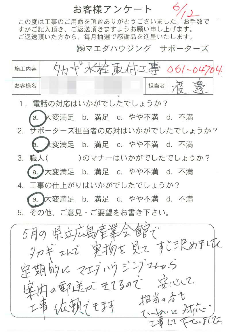5月の県立広島産業会館でタカギさんで実物を見てすぐ決めました。定期的にマエダハウジングさんから案内の郵送が来てるので安心して工事依頼できます。担当の方もていねいに対応・工事して下さいました。