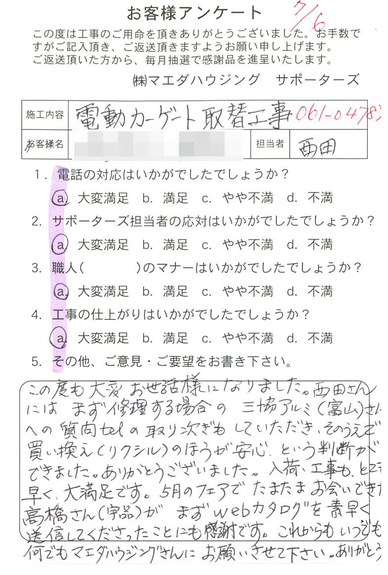 この度も大変お世話になりました。西田さんにはまず修理する場合の三協アルミ(富山)さんへの質問Telの取り次ぎもしていただき、そのうえで買い換え(リクシル)のほうが安心という判断ができました。ありがとうございました。入荷・工事もとても早く大満足です。5月のフェアでたまたまお会いできた高橋さん(宇品)がまずwebカタログを素早く送信してくださったことにも感謝です。これからもいつでも何でもマエダハウジングさんにお願いさせて下さい。ありがとう |