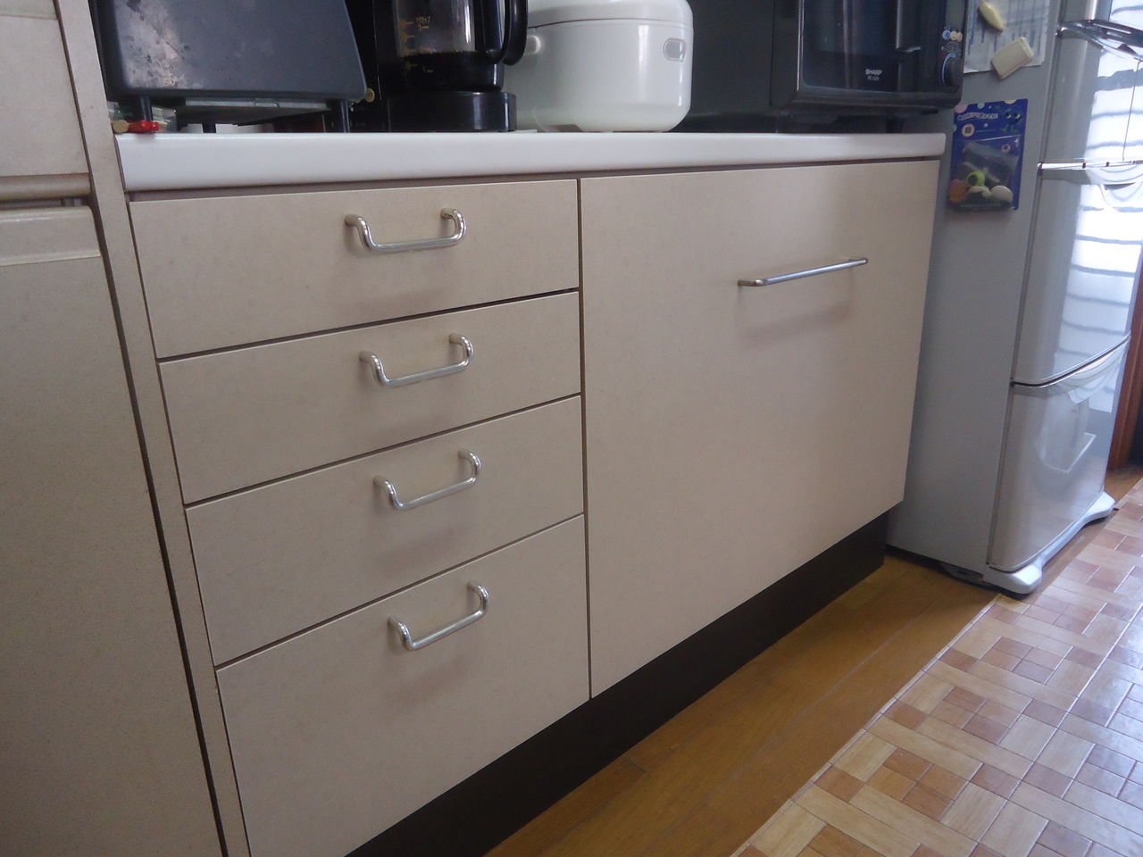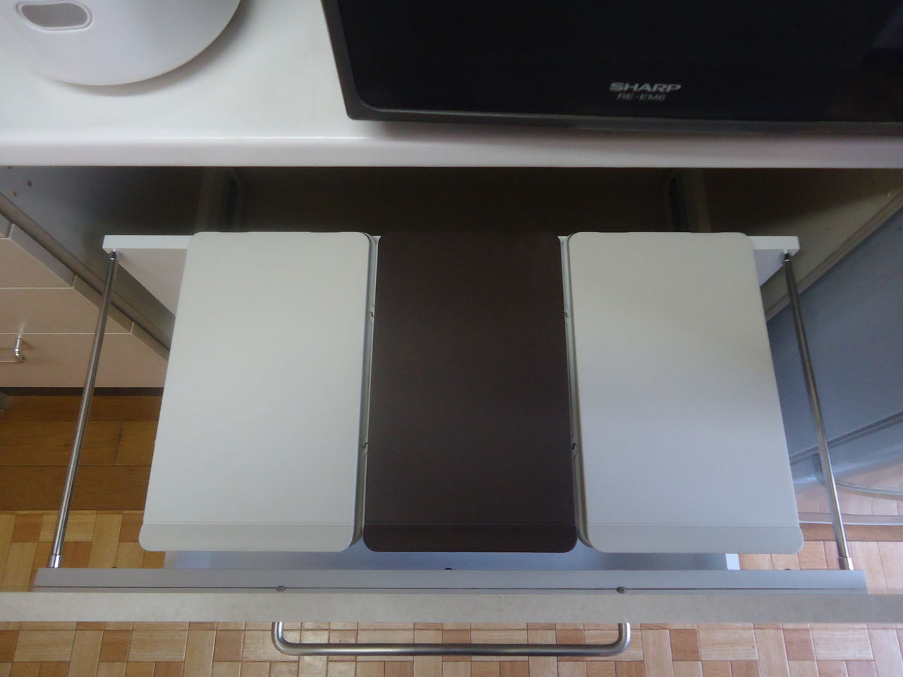 もともとは両開き扉でしたがごみ箱を出し入れしやすいようスライド引出しに変更。