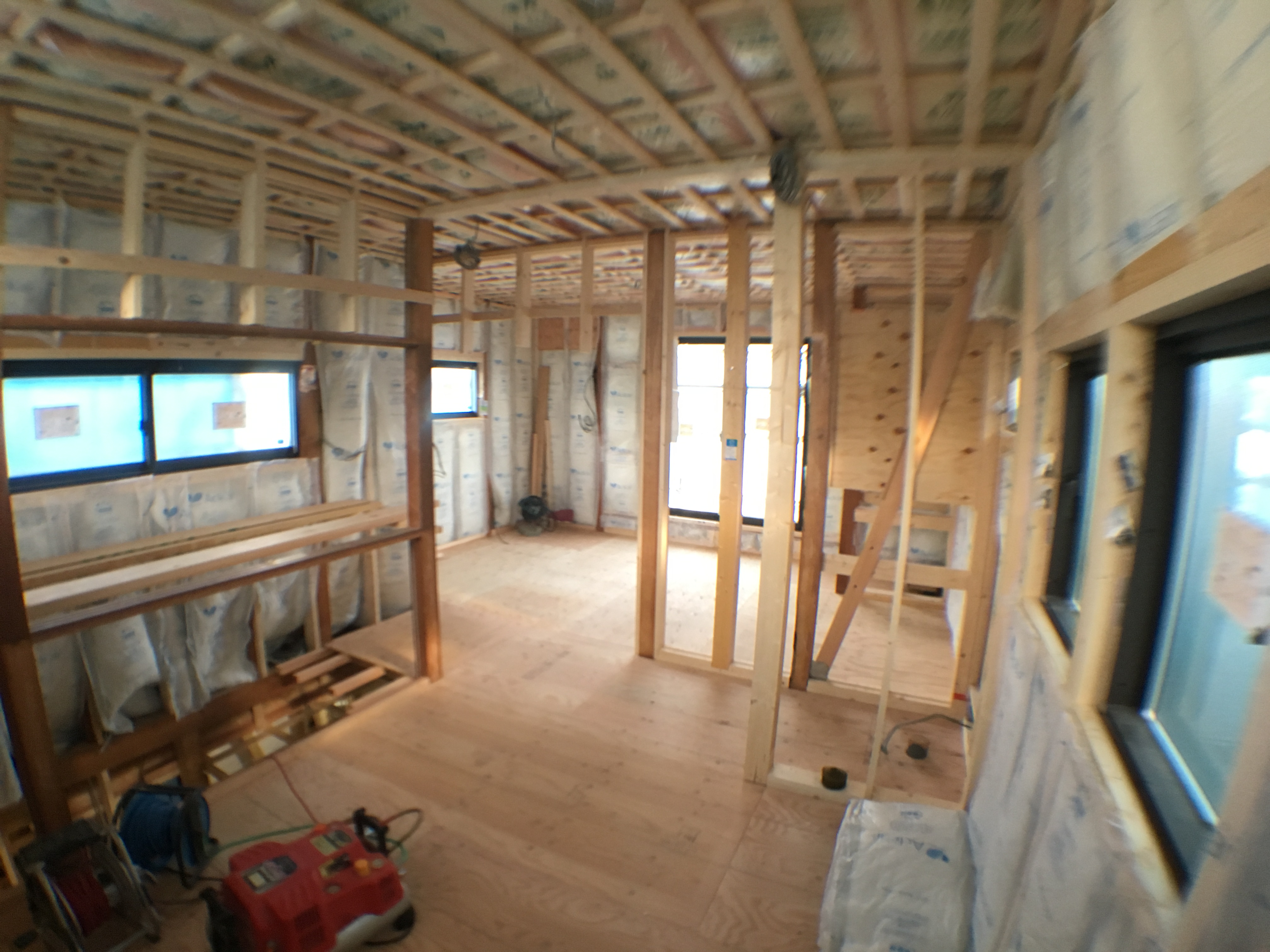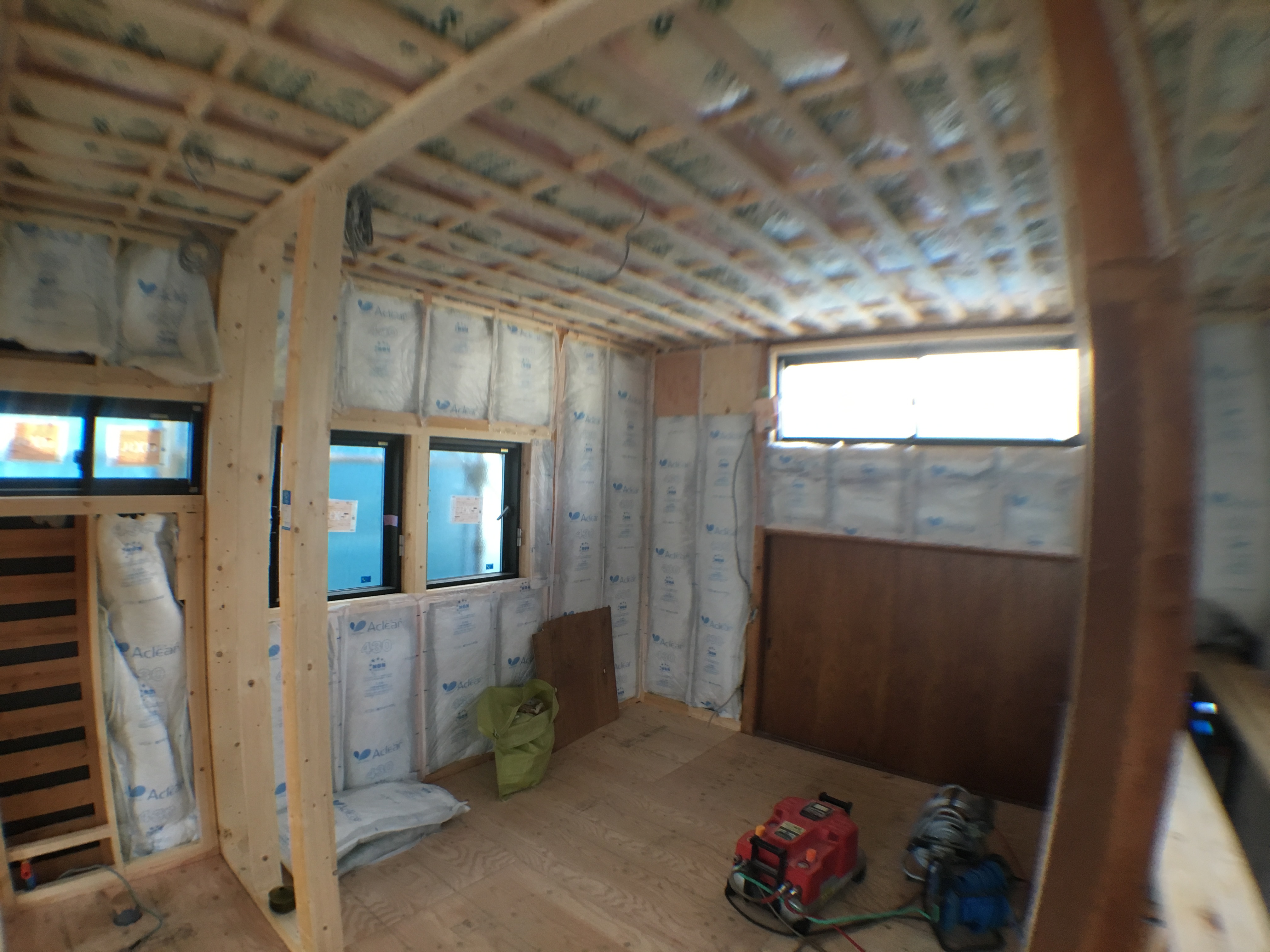 窓のサッシなどは、もちろん断熱サッシに交換し、床・壁・屋根裏には断熱材を敷き詰めていきます。