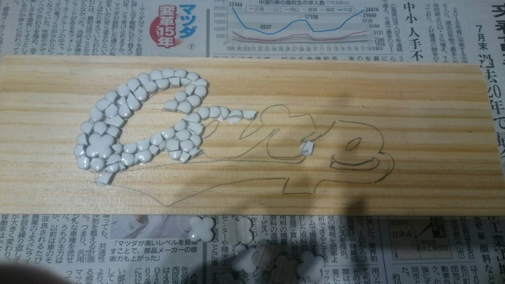 モザイクタイルを並べ、文字や絵を描くのですが、