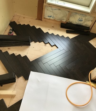 8畳で750枚の板を調整しながら貼りました。 普通のフロアでしたらは24枚で終わります。