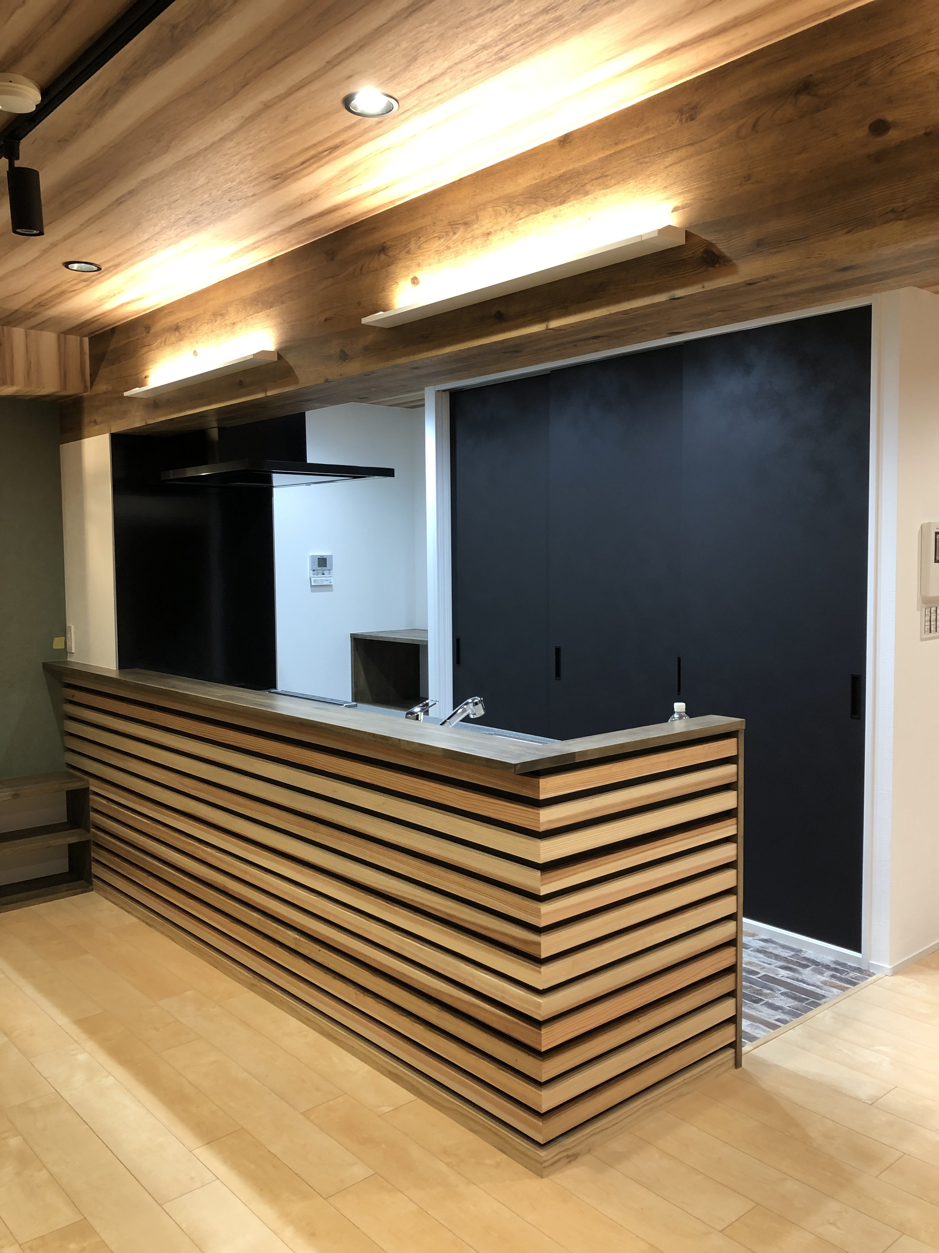 キッチンの前壁は杉の木で横格子を。