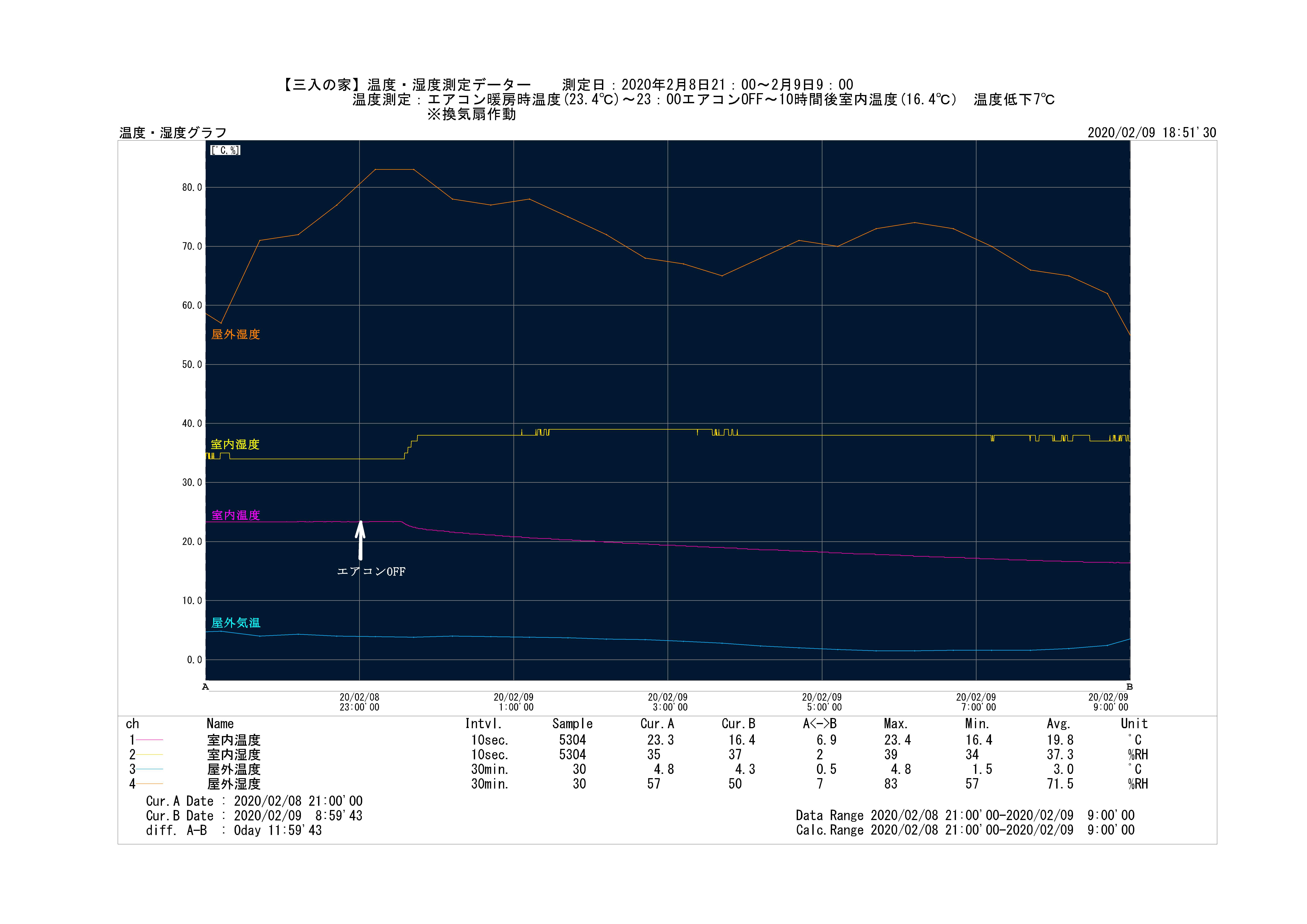 23:00エアコンOFF時点の室内温度23.3℃。翌朝9:00の室内温度16.4℃。 、僅か6.9℃の低下!!