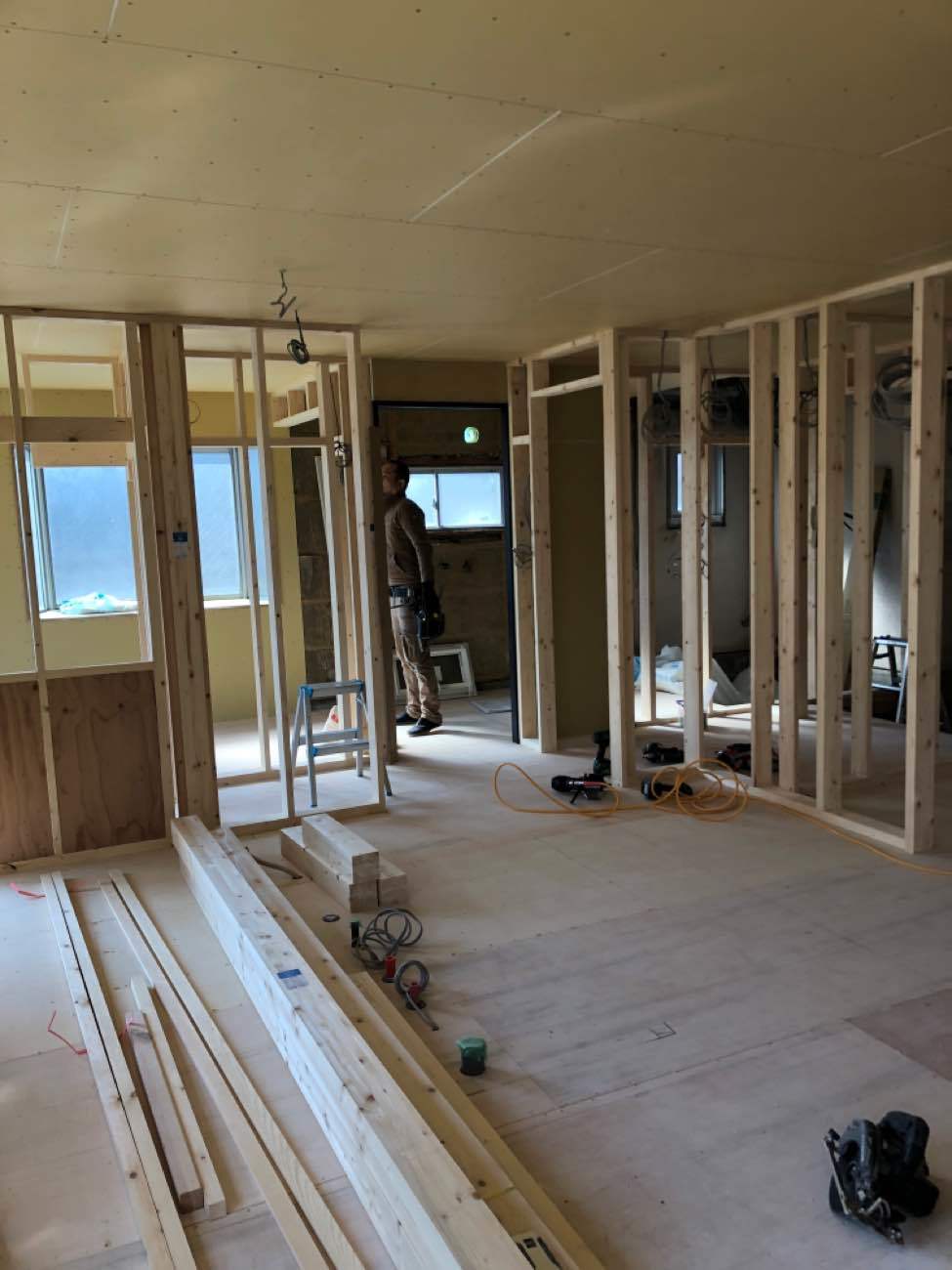 鉄骨造ならではの大空間です。これから間仕切り壁を作って行きます。