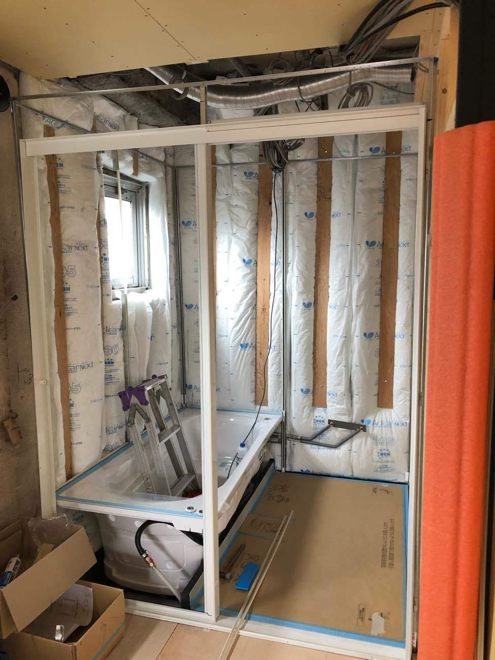 この時点で電気配線工事や給排水管工事は床下、壁内、天井裏で施工しておきます。