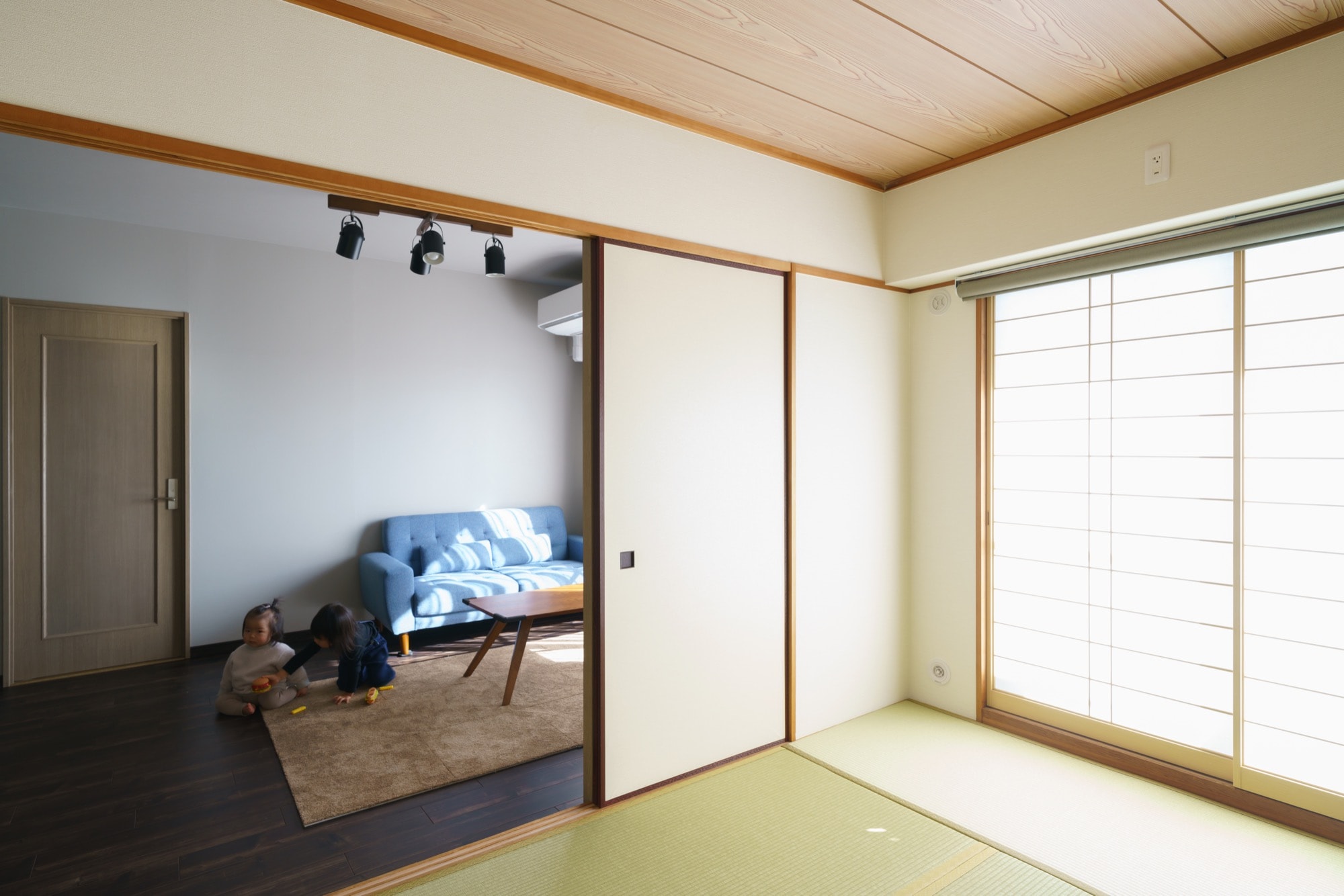 「いつかはマイホームを叶えたい」とリフォーム済みの中古戸建てや新築物件を見て回る中で、マエダハウジングのリノベーション完成見学会に参加されたM様。数年後に当時の生活圏に近い場所で築25年の中古マンションに出合います。「リノベーションを依頼するならマエダハウジング」と決めてくださっていたことから、物件内覧の時点で弊社担当者が同行させていただきました。現地でリフォームの必要な箇所や理想のイメージなどの確認して、そのまま購入を決意。自由な壁紙使いにより、好きな色に囲まれたお気に入りの住空間を手に入れました。