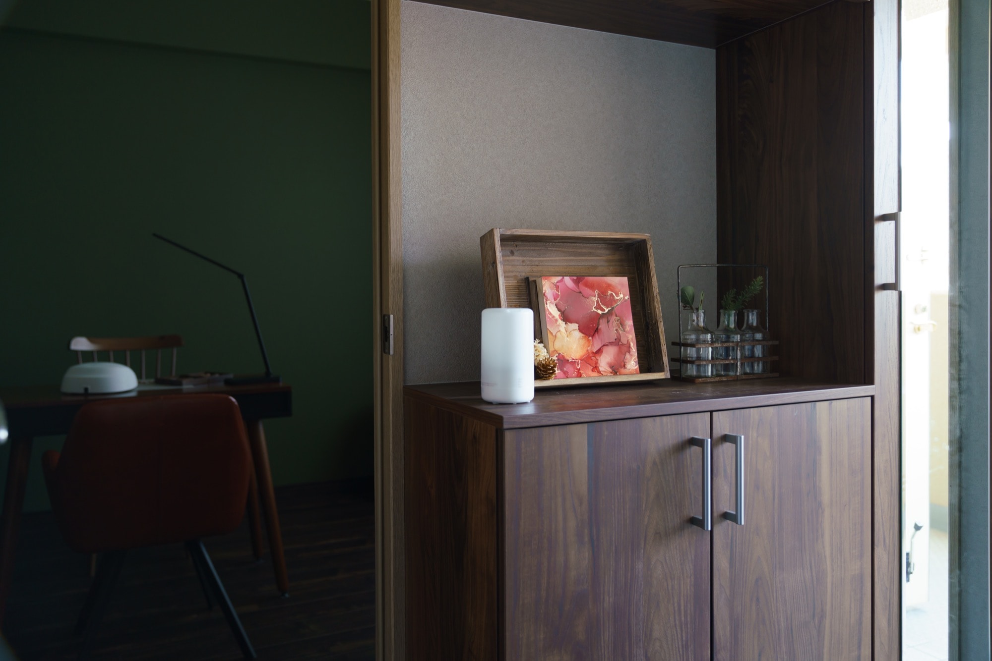 奥様が営むネイルサロン用の洋室はカーキ色のアクセントクロスでブラウンのフローリングと統一感を意識しました。