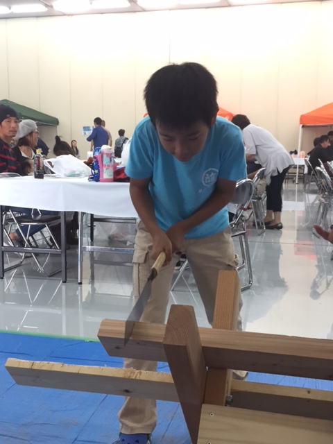 丸太切りに挑戦。普段木を切る機会は無いと思いますが、ぜひ子供達にも体験してほしくて開催しています。優勝者にはまめでこ商品券プレゼント!