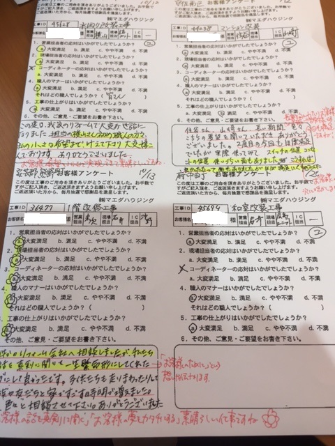 なかでも、多くは担当者や職人さんに対するお褒めの言葉です。「ありがとう」や「〇〇さんに頼んでよかった」と言ってもらえることが、私たちの栄養剤です。これからもこのお客様のお声を励みに頑張っていきます。