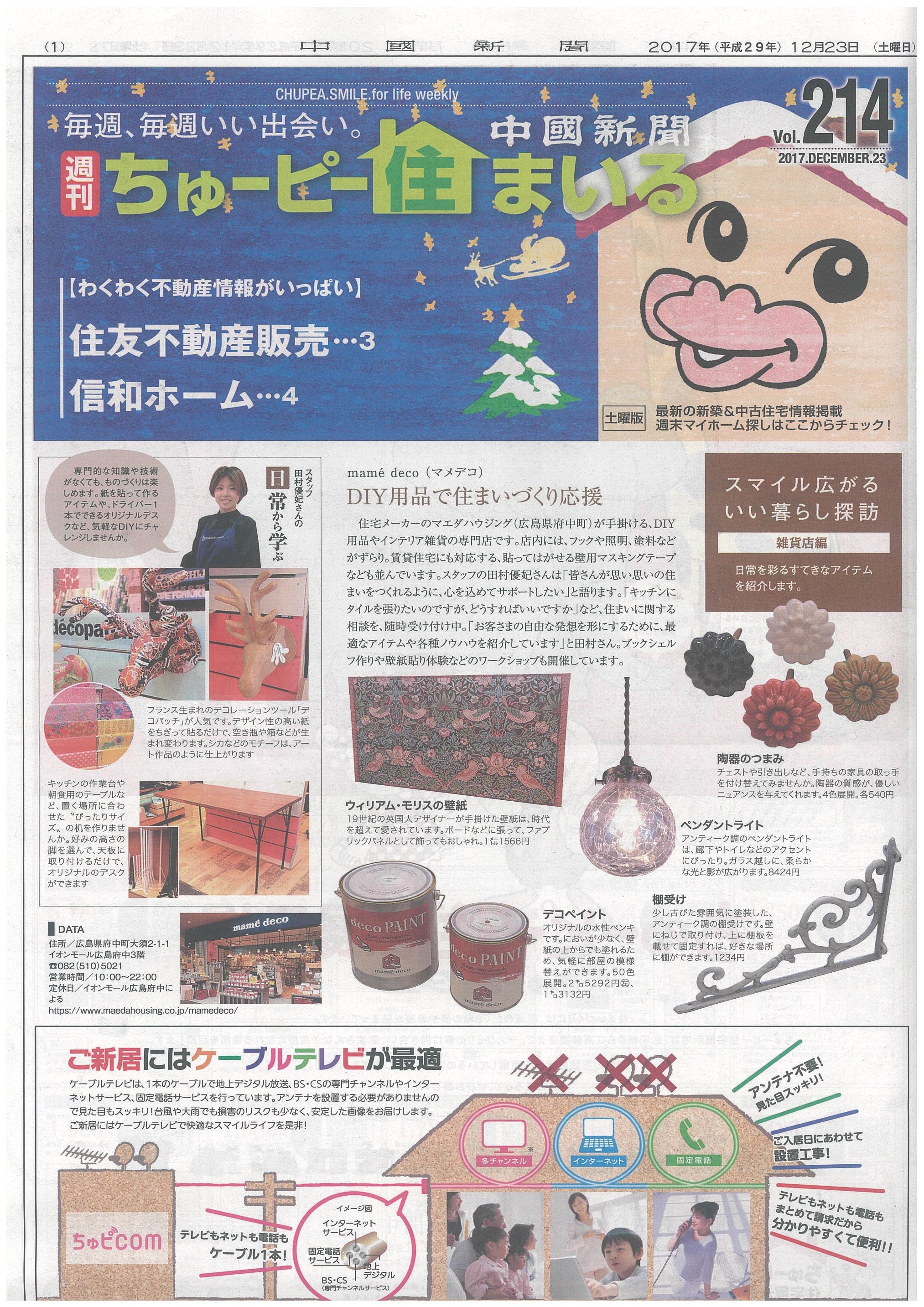 中国新聞の「ちゅーピー住まいる」の今週号にまめでこが掲載されました。