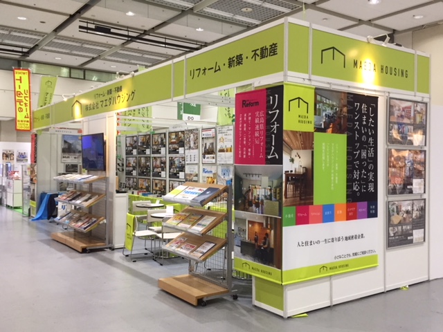 マエダハウジングのブースは入口入って左側ですがいつもの施工事例掲に新しくタペストリーをかけていますので良く目立ちます。