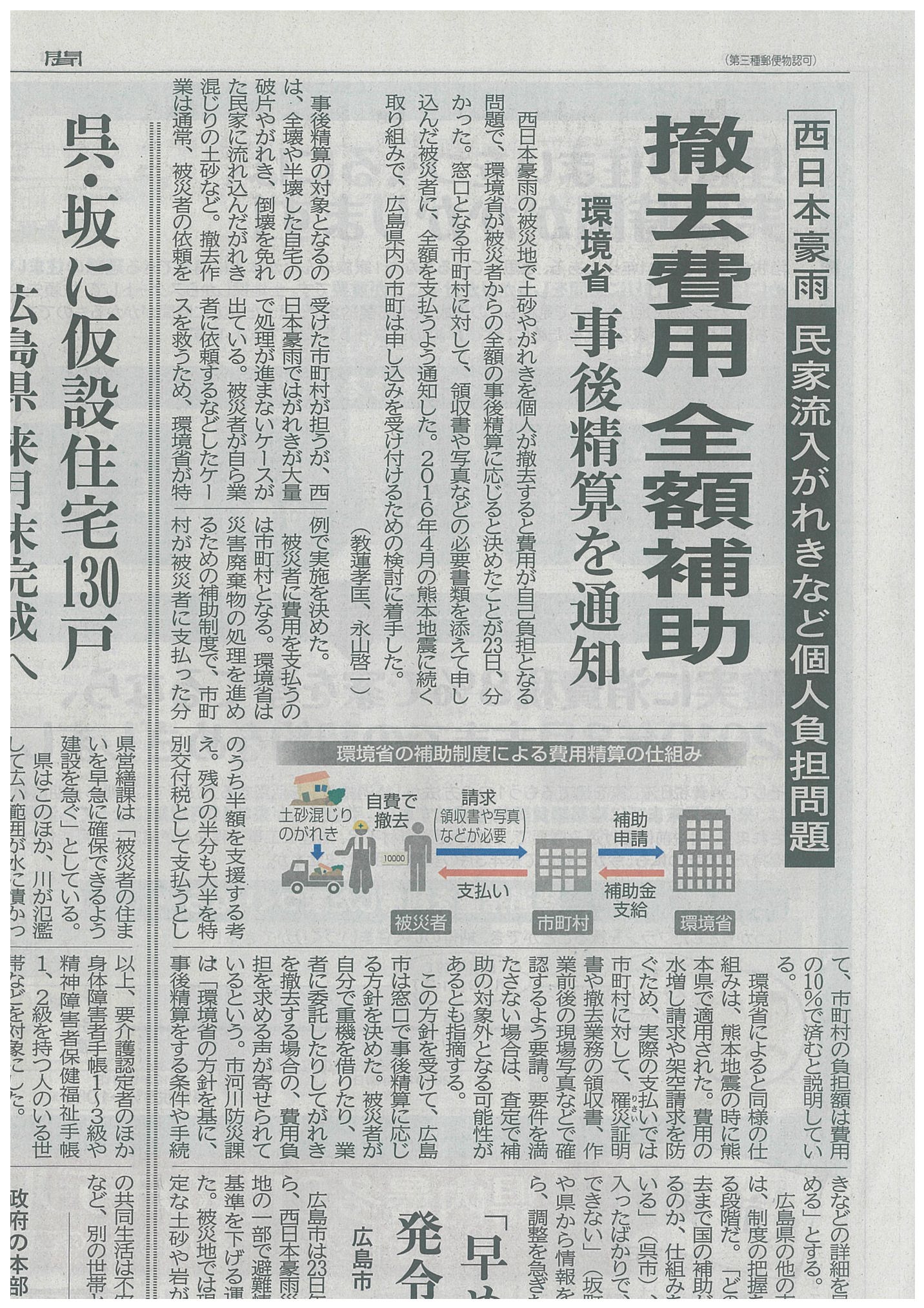 「西日本豪雨の被災地で土砂やがれきを個人が撤去すると費用が自己負担となる問題で、環境所が被災者からの全額の事後清算に応じることが決まった。