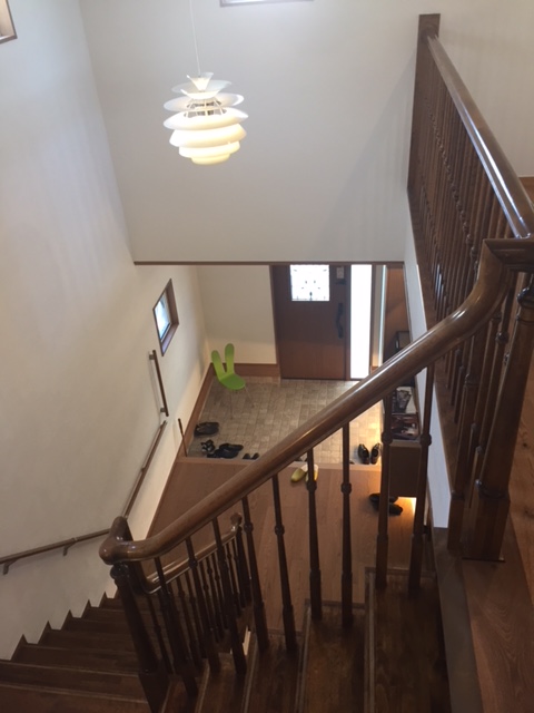 唯一既存を残した階段、吹き抜けにはルイスポールセンのスノーボールを。