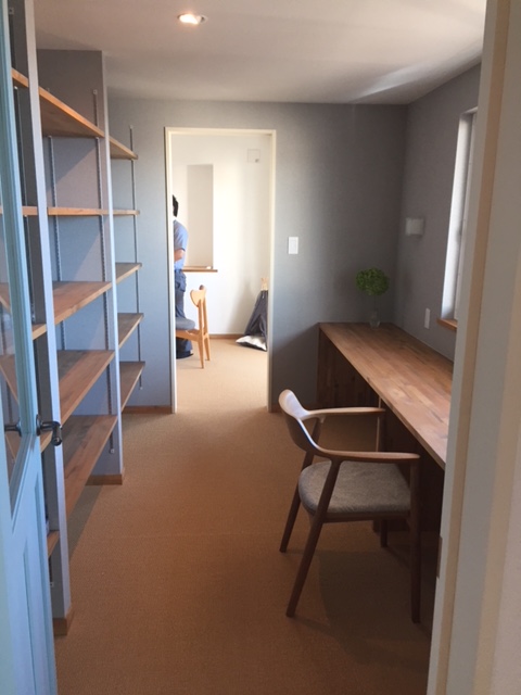 概ねご主人に好評だった書斎は壁一面の本棚と海が見える窓。