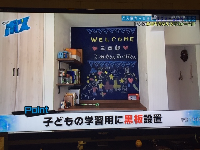 黒板塗料を塗った小上がりの和室には、「Welcome 三四郎 こみやさん あいださん」と子供さんが絵を描いてくれていました。