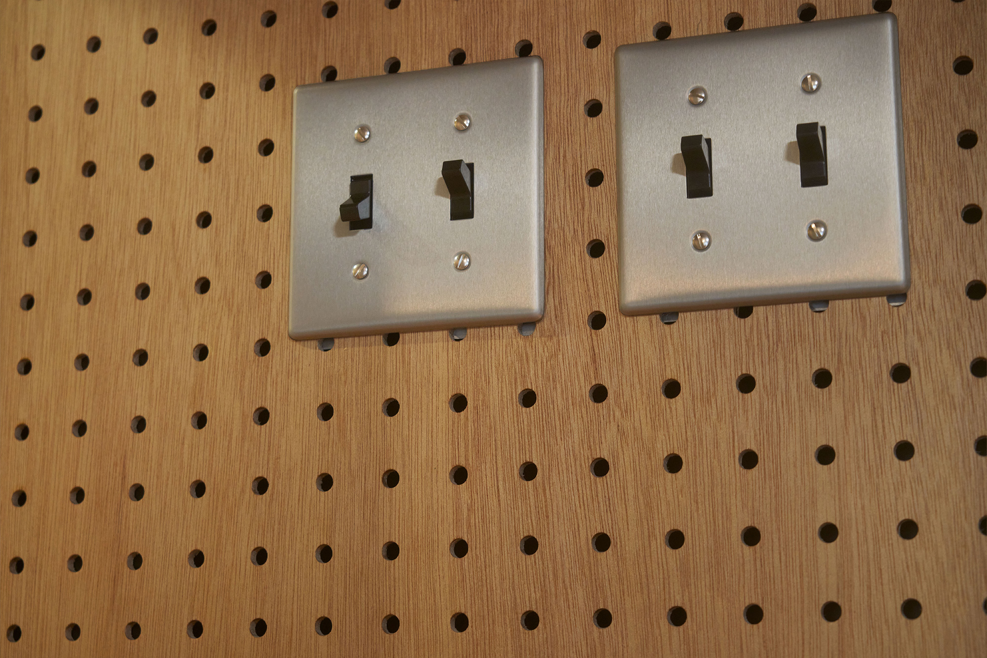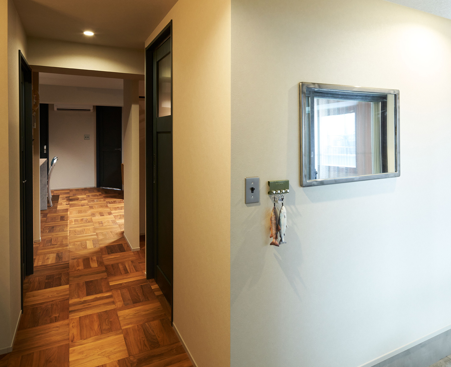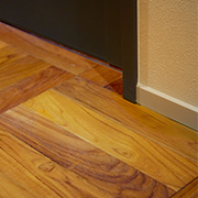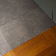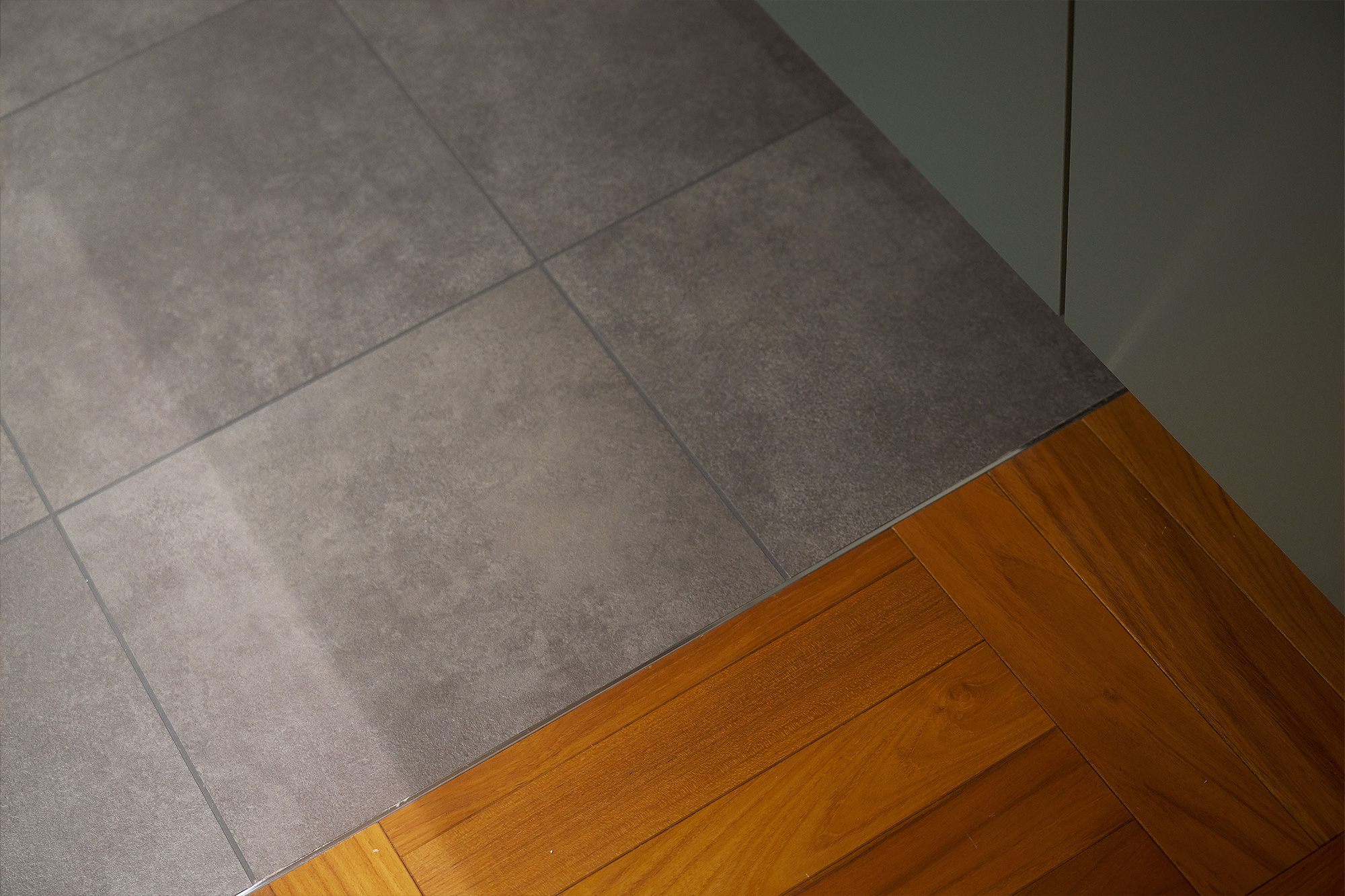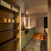 コンクリート仕上げの土間、チークのパーケットフローリング、フロアタイル、セメントのアクセントパネル、有孔ボード、大理石タイルなど異素材を楽しめます。
