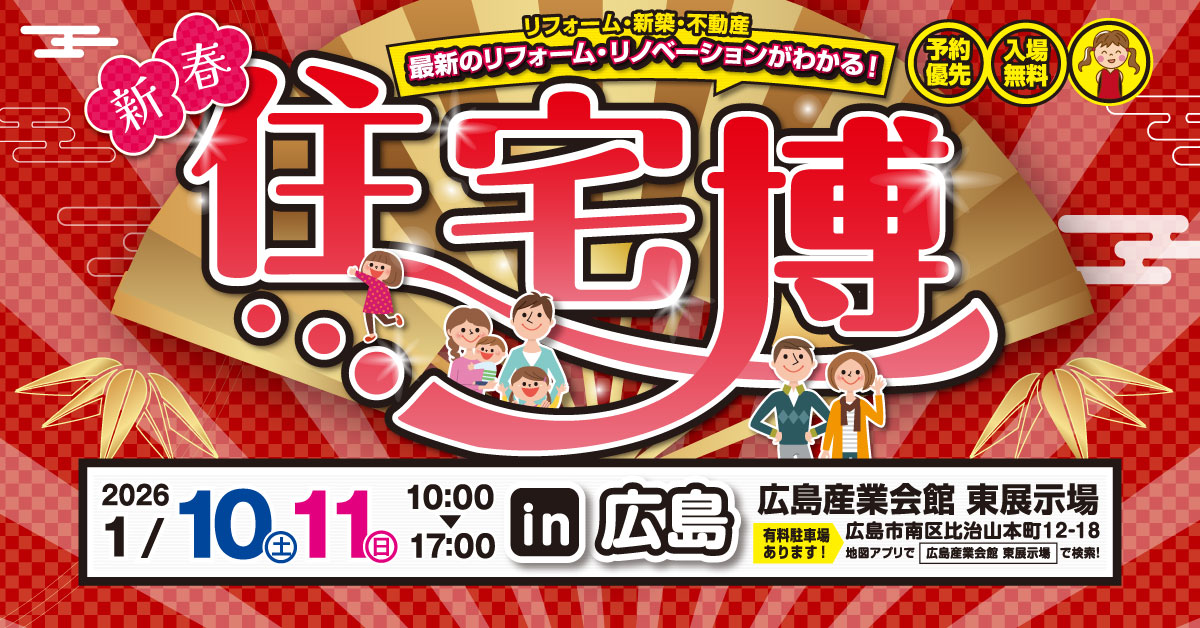 新築・リノベーション・リフォーム・物件探しなど 最新の安心・安全リフォームを知る2日間!! 土地探しや資金計画、新築・リフォームで迷っているけど進め方が分からない... 事前予約の上ご来場の方には、 ご来場の上、会場でご相談&お見積り依頼をされた方は、 会場の駐車場を2時間無料にいたします。 会場でアンケートにご協力いただいたお客様に、書店でも販売中のリフォーム情報雑誌をプレゼント! リフォームローン・各種ローンについてご相談を承ります。 お気軽にご利用ください。 1月10日 10:30〜11:30 新春チャンス!! メーカー等の展示ブースでスタンプ(サイン)を集めて、 豪華景品をGETしましょう! 今回はあったかグッズシリーズです。 A賞:タジン鍋or南部鉄瓶急須 2名様 各メーカーが「住宅博」だけの特典を準備してお待ちしています♪ 冬寒い、夏暑いを解消して、省エネで快適なお住まいにしませんか? 数々の様々なリフォームを経験した設計士が あなたのご検討内容の整理をお手伝い。 家族の変化にあわせて「これから」の住み心地と安全性を追求してみましょう。 「自分らしい空間で暮らしたい」 古民家という価値ある建物に対して建築士がお施主様の思いに寄り添い、最適解を提案いたします! 実家の二世帯リノベーションは、子世代、親世代それぞれにメリット! 親世帯の老後を見据えた環境を作ります。 親世帯から育児、家事等サポートを受けやすくなり 土地代がかからないため、新たな住まい方をコスパよくで実現できます。 こんなお悩みありませんか? 今後のライフプラン、ご予算やお家の状態などからどちらが良いか考えていきましょう! 補助金・助成金・免税制度などもわかりやすく説明します。 ご夫婦2人のこれからの生活を充実させる夫婦円満リフォーム ライフスタイルや家族構成の変化に伴い 万が一に備えて、耐震診断・耐震プラン提案を受けてみませんか? 広島県は、「耐震意識が低い県」と言われています。 プラン集・模型など多数展示 250組を超えるお客様にご来場いただきました! 〒732-0816 東館の敷地内に広々とした駐車場がございますが、西館の地下駐車場や、西館と東館の間の平面駐車場もご利用いただけます。