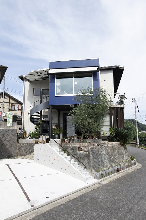 2階へとつながる螺旋階段とオーニングが建物をより印象付けている。