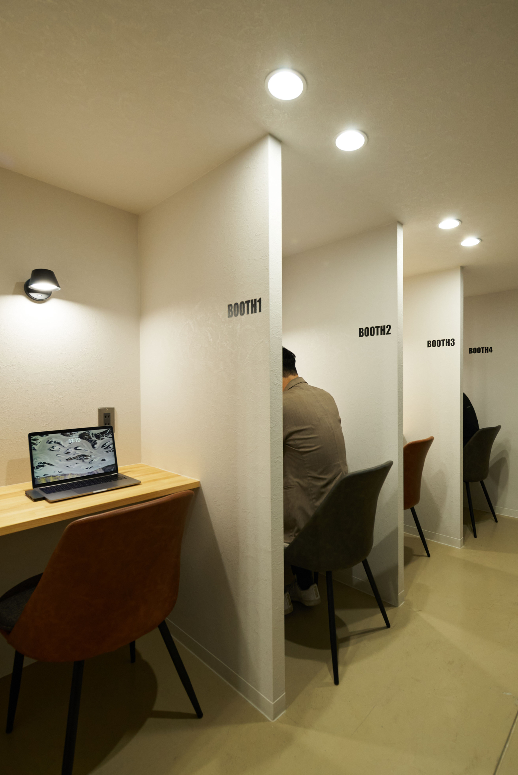 壁で仕切られた個別ブースは、一人ひとりが集中して業務に取り組めるよう工夫されています。