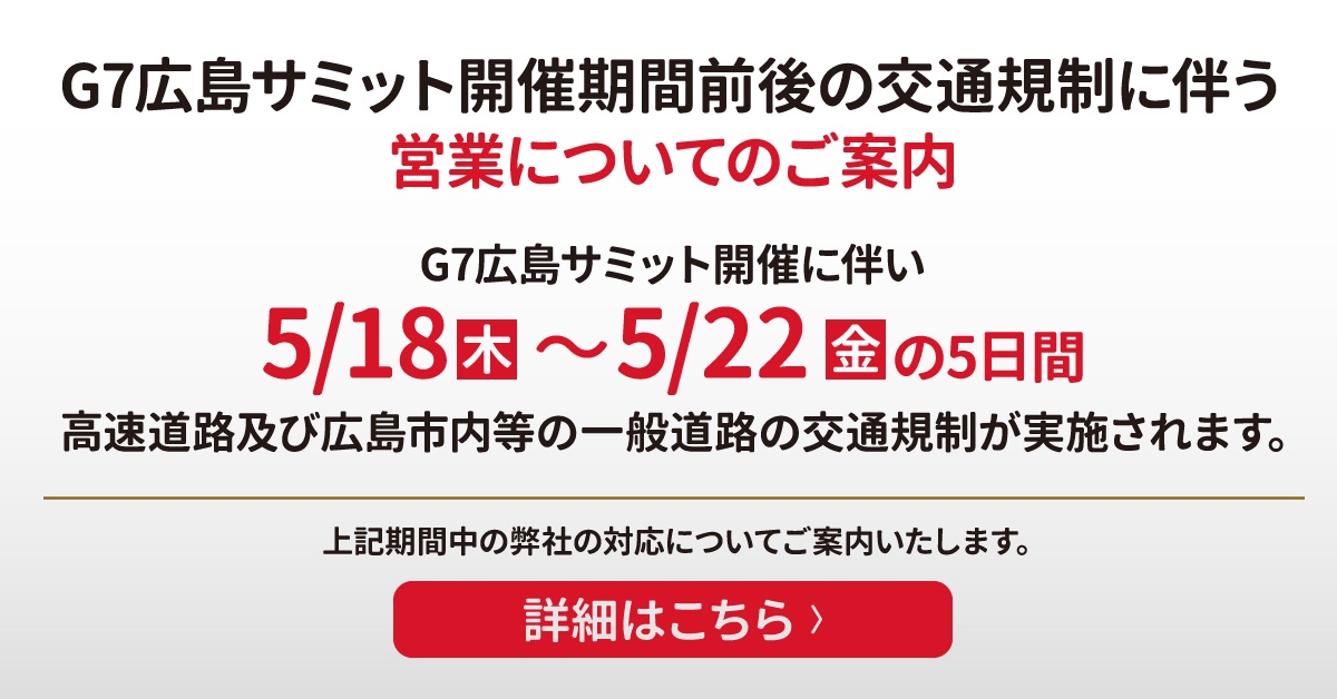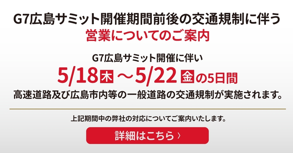 G7広島サミット開催に伴い、5/18(木)~5/22(月)の5日間、高速道路及び広島市内等の一般道路への交通規制が実施されます。