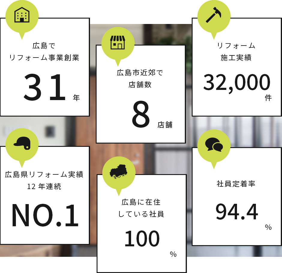 リピートやご紹介が半数を超えるほど、ご縁をいただいたお客様と厚い信頼関係を築くことができ、なかでも創業期を過ごした府中町では12,000世帯ある持ち家のおよそ2,000軒がお客様という、とても嬉しいご縁を繋いでこれました。