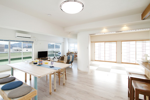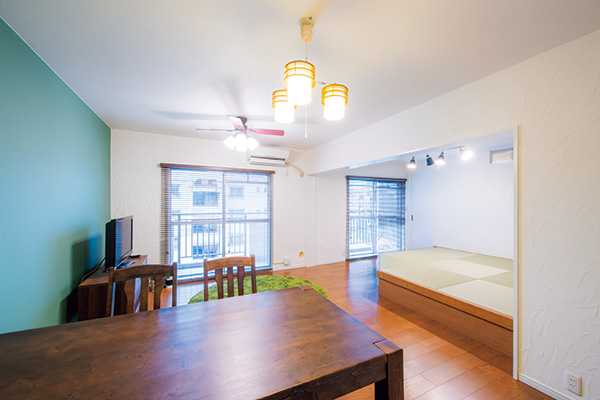こちらは、築31年の中古マンションを購入され、2カ月かけて全面リノベーションを行ったお宅です。もともとは3LDKだった間取りを1SLDKに変更し、開放感のある空間へとチェンジ。自然をテーマにリノベーションを行い、ナチュラルさと明るさが感じられる空間になっています。また、リビング中心に壁を漆喰塗りにしたり、小上がりの和室を設けたりと、和の要素を至る所に取り入れています。