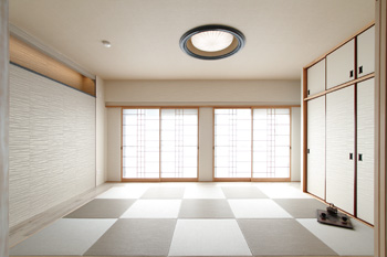 全体的にリビングの雰囲気にマッチするような、優しい雰囲気を演出!畳には、市松模様を採用し、障子のデザインは奥様が担当するなど、細部にまでこだわりが詰まっています。