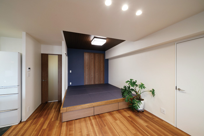 こちらは、もともと住んでいた築23年のマンションを2カ月かけて、全面リノベーションを行った事例です。こちらのお宅は、猫と家族同様暮らしており、猫が汚した床や壁が気になり始め、リフォームを決心されたそうです。全体的に北欧のようなナチュラルさもありながら、和の要素も取り入れており、小上がりの和室ではシックな畳とブルーの壁紙で落ち着いた雰囲気を演出しています。