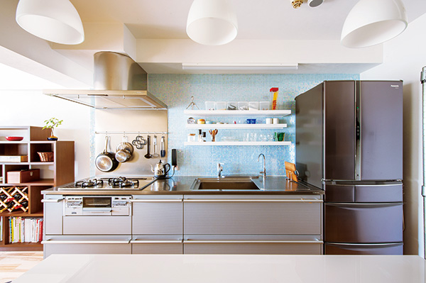 こちらは、築年数約29年のマンションのキッチンをリノベーションした事例です。工キッチンは、通常のものよりも奥行きがあるものをチョイス。壁面にはブルー系のモザイクタイルを採用し、清潔感のある海外風のキッチン空間となっています。キッチンの上にはおしゃれな造作棚を設置し、ディスプレイ空間としても機能しています。