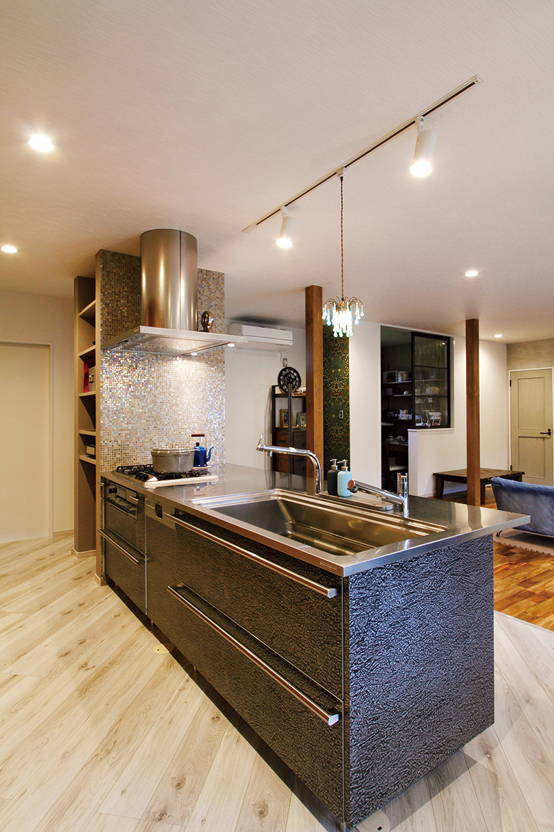 こちらは、築年数約35年の戸建て住宅のキッチンリノベーション事例。カウンター型にすることで、リビング空間を見渡せるようになっています。写真左側には、両面収納が可能なパントリーを確保。壁面のモザイクタイルもアクセントになっています。また、リビングとの緩やかに空間分けするために斜め張りの床材を選びました。